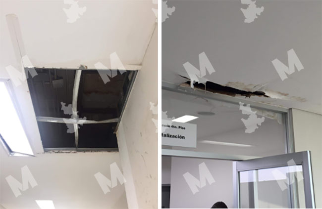 En cuanto al interior del hospital ubicado en la Unidad Habitacional de Agua Santa, la situación no es distinta, pues en varios pisos del edificio principal se pueden observar distintos desperfectos, como lo son la falta de plafones, grietas en los techos, pisos quebrados y rastros de humedad son evidentes en varios pisos.