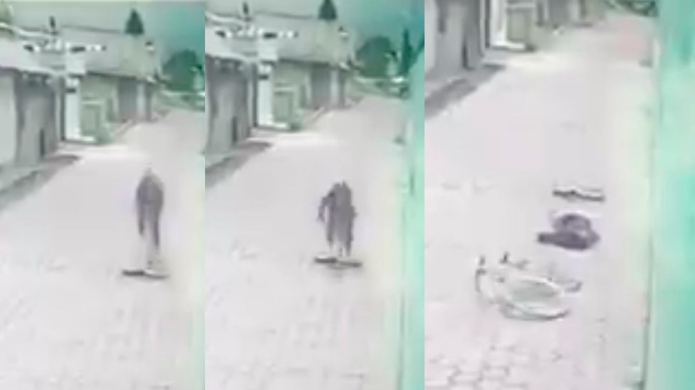 Una cámara de seguridad captó el momento en que un ciclista se atora con un hoyo, cae de boca y muere por el impacto