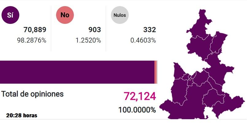 A las 20 horas se abrió la plataforma para conocer los datos preliminares y hasta las 20:28 horas se habían computado 72 mil 124 opiniones expresadas en Puebla.