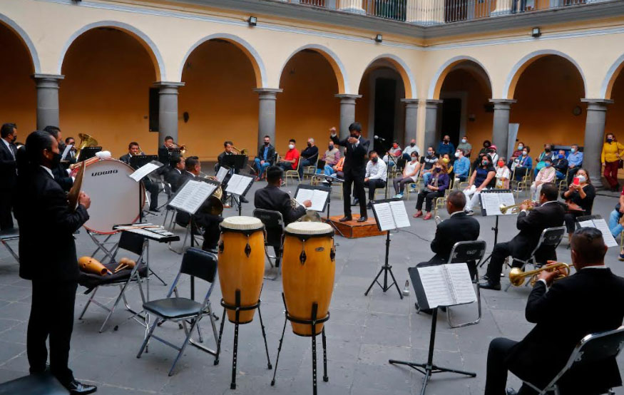 Puebla, Pue.- Como parte de los festejos por los 200 años de la creación del Chile en Nogada, el ensamble de metales de la Banda Sinfónica Mixteca tuvo una presentación en la Casa de la Cultura para homenajear al platillo barroco por excelencia.