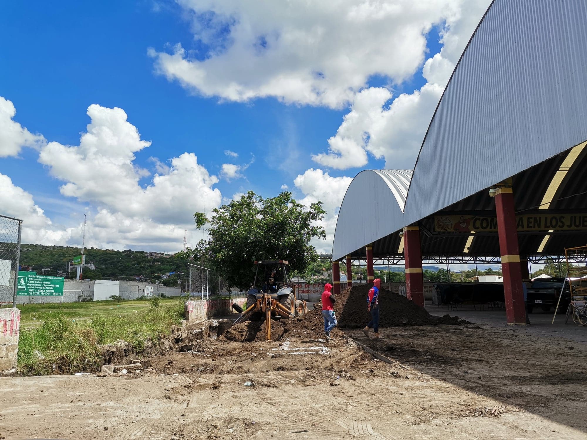 Juan Carlos Larios ha iniciado la excavación con maquinaria para la cimentación de un módulo de baños en un área común que es empleada como área de carga y descarga, así como de estacionamiento y paso de peatones, toda vez que esta considerada como un paso para este mercado, pero el líder se quiere apropiar del lugar, asegurando que la agrupación en la propietaria de este lugar, sin mostrar ninguna escritura que los acredite como dueño.