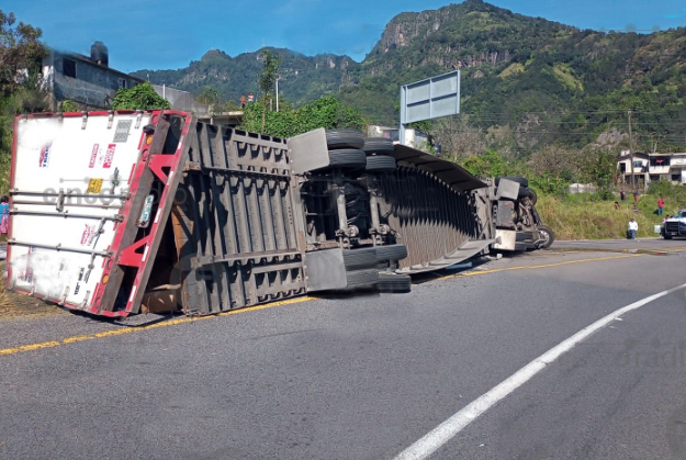 Teziutlán, Pue.- Esta mañana un tráiler se volcó en la entrada al municipio de Teziutlán sobre la autopista.