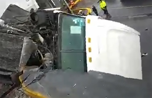 De acuerdo con los primeros reportes, el conductor ya no pudo controlar la unidad cuando ésta comenzó a derrapar, pero sí logró frenar para minimizar el impacto y evitar que cayera por completo. El sujeto tuvo que salir por la parte trasera de la cabina para poder ponerse a salvo. Tras este hecho, se informó que nadie resultó lesionado.