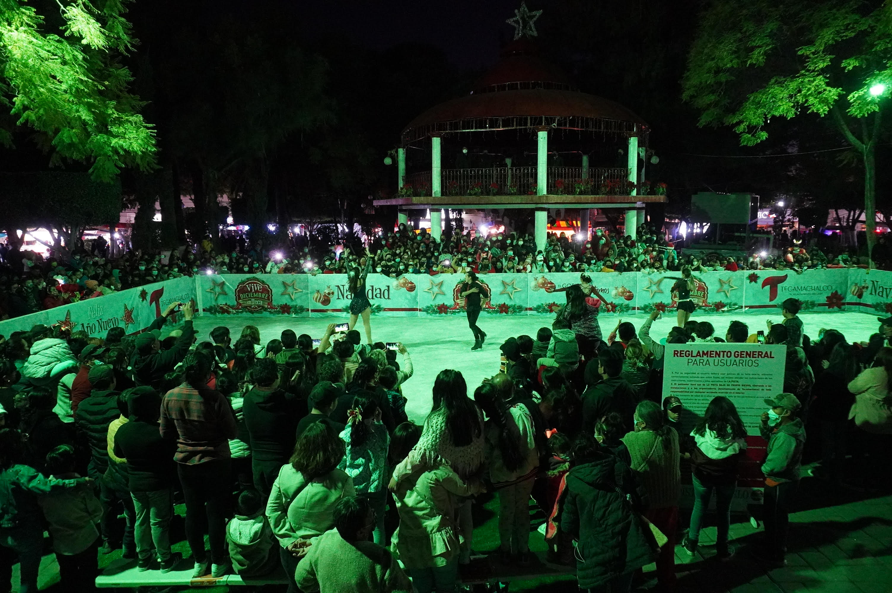 Tecamachalco, Pue.- La noche de este miércoles autoridades locales inauguraron la pista de hielo, realizaron el encendido del árbol de navidad y de la Villa Iluminada instalada en el parque Juárez, evento al cual se dieron cita cientos de habitantes.
