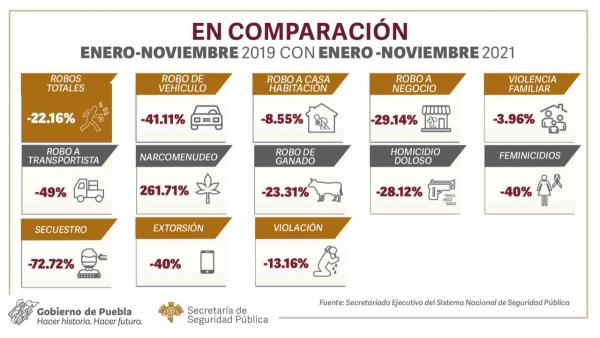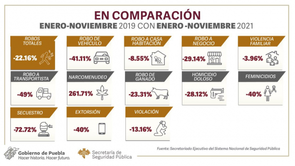 Los datos más recientes evidenciaron que, de enero a noviembre de 2019 en comparación con el mismo periodo de 2021, hubo una disminución del 72.72 por ciento en el delito de secuestro, mientras que el robo a transportista se redujo en 49 por ciento.