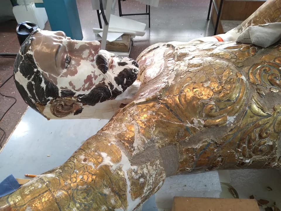 Izúcar de Matamoros, Pue.- La escultura de Santiago Apóstol del municipio de Izúcar de Matamoros, ya es una sola pieza, luego de que el 19 de septiembre del 2017, esta imagen resultara con severas afectaciones por el sismo, tras colapsar una cúpula del templo que la resguardaba, sin embargo, hace unas semanas la escultura ya ha sido ensamblada y hoy en una sola.
