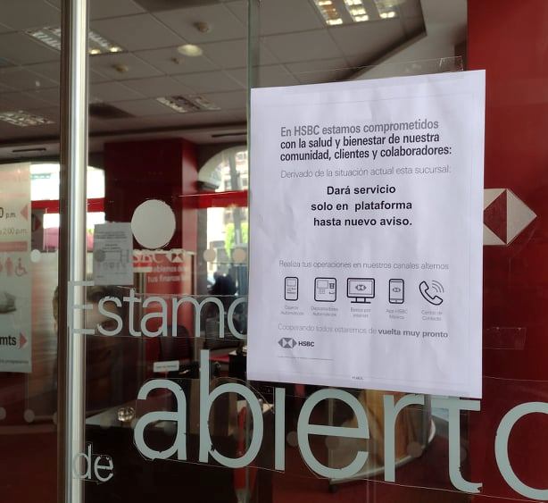 En la sucursal del banco HSBC a través de un aviso seinforma “En HSBC estamos comprometidos con la salud y bienestar de nuestra comunidad, clientes y colaboradores, derivado de la situación actual esta sucursal dará servicio solo en plataforma hasta nuevo aviso, realiza tus operaciones en nuestros canales alternos, cooperando todos estaremos de vuelta muy pronto”.