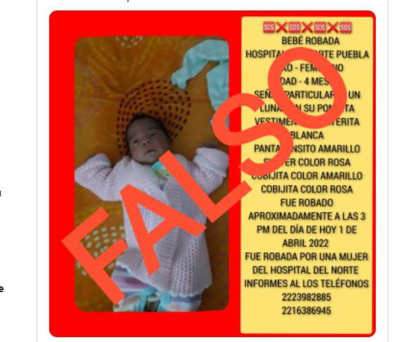 PUEBLA, Pue. Con relación a la información que circula en redes sociales sobre el "robo de una bebé de cuatro meses" del Hospital General de Zona Norte, la Secretaría de Salud informó mediante sus canales institucionales que es falsa.
