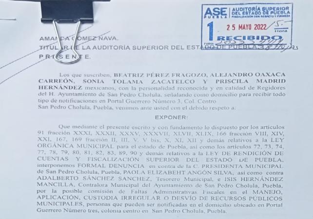 Los regidores Beatriz Pérez Fragoso, Alejandro Oaxaca Carreón, Sonia Tolama Zacatelco y Priscila Madrid Hernández, acusaron ante la ASE a la presidenta municipal, Paola Angón Silva, al tesorero Adalberto Sánchez y a la contralora Isis Hernández Mancilla.
