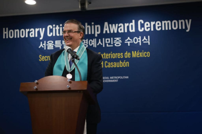 El canciller mexicano Marcelo Ebrard fue distinguido como ciudadano honorario por el alcalde de Seúl, Oh-Se-Hooon.