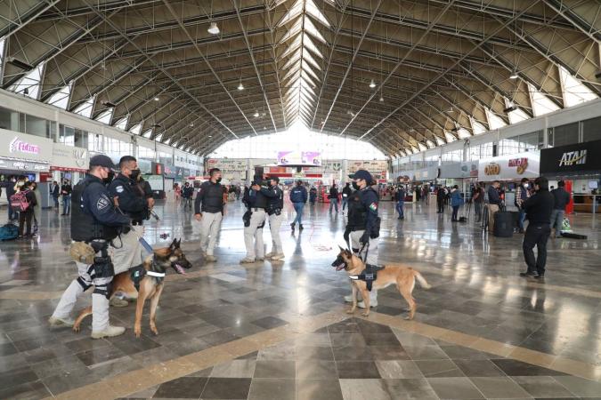 Durante la implementación del operativo, elementos de la Policía Municipal de Puebla con apoyo de ejemplares caninos inspeccionaron salas de espera, andenes, áreas de equipaje y paqueterías.