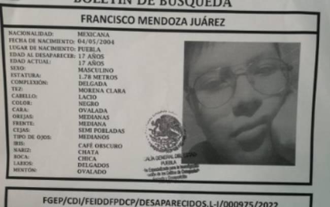 Puebla, Pue.- La Fiscalía General de Puebla dio a conocer la desaparición de Francisco Mendoza Juárez de 17 años de edad.