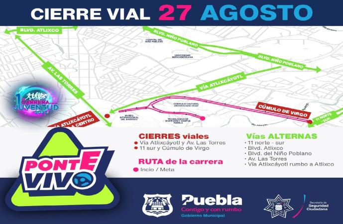 La Dirección de Control de Tránsito, a partir de las 19:30 horas llevará a cabo cierres a la circulación sobre Vía Atlixcáyotl y Avenida Cúmulo de Virgo. Paralelamente, agentes de tránsito habilitarán como rutas alternas Bulevar Atlixco y Avenida 11 Sur.