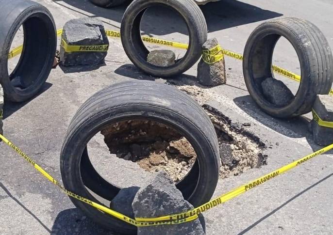 Sin embargo, el desperfecto no quedó arreglado y únicamente elementos de la policía colocaron cintas amarillas y rodearon la circunferencia con llantas bajo el argumento de tratarse de un vía estatal.