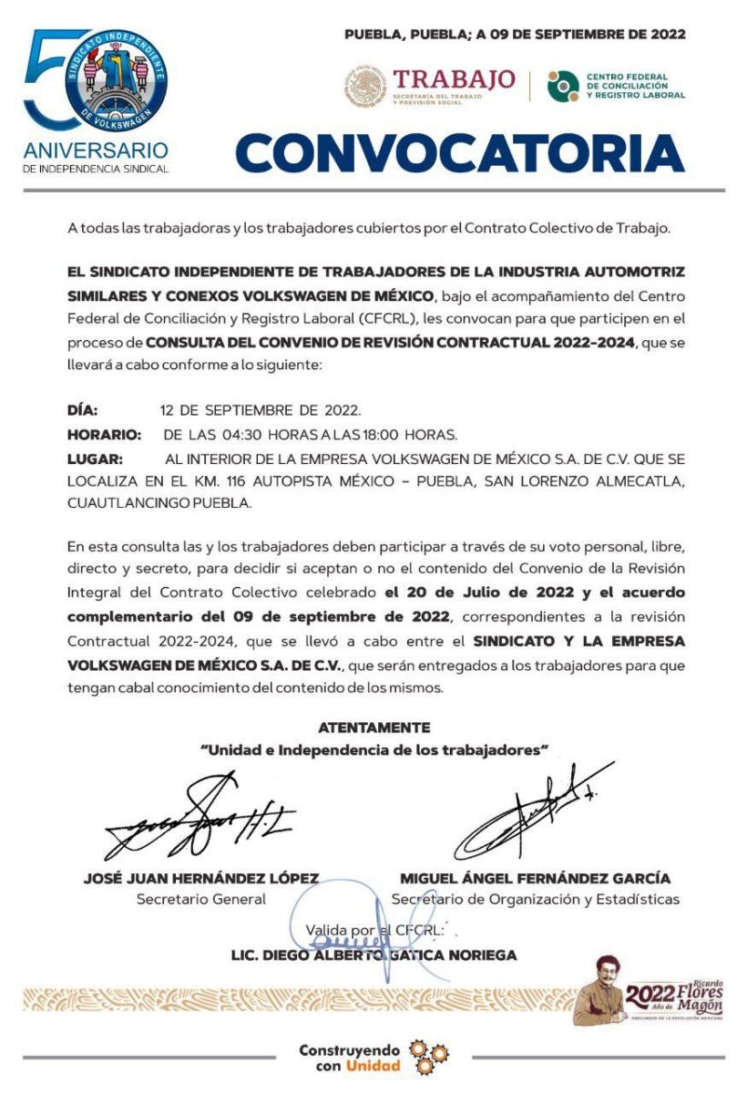 De esta manera, el Sindicato Independiente de Trabajadores de la Industria Automotriz Similares y Conexos Volkswagen de México (Sitiavw), convoca a sus afiliados a votar la propuesta salarial ofrecida por la empresa, que es un aumento del 9 por ciento directo al salario y un 2 por ciento en prestaciones.