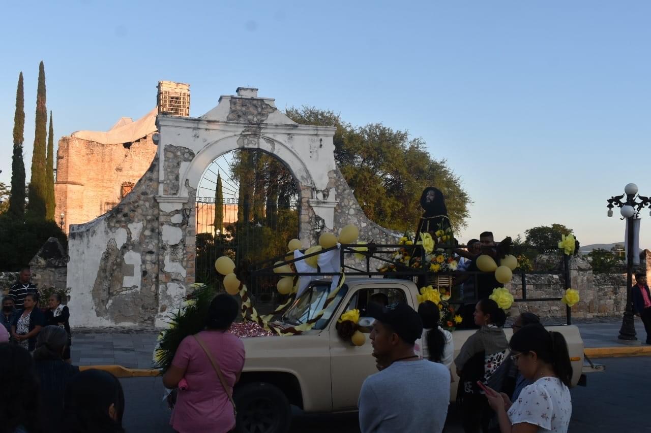 Acompañados de globos amarillos, música y flores, los asistentes enmarcaron esa actividad al pasear a una de las figuras más veneradas en los alrededores del enorme convento aún en reparación tras el sismo del 2017.