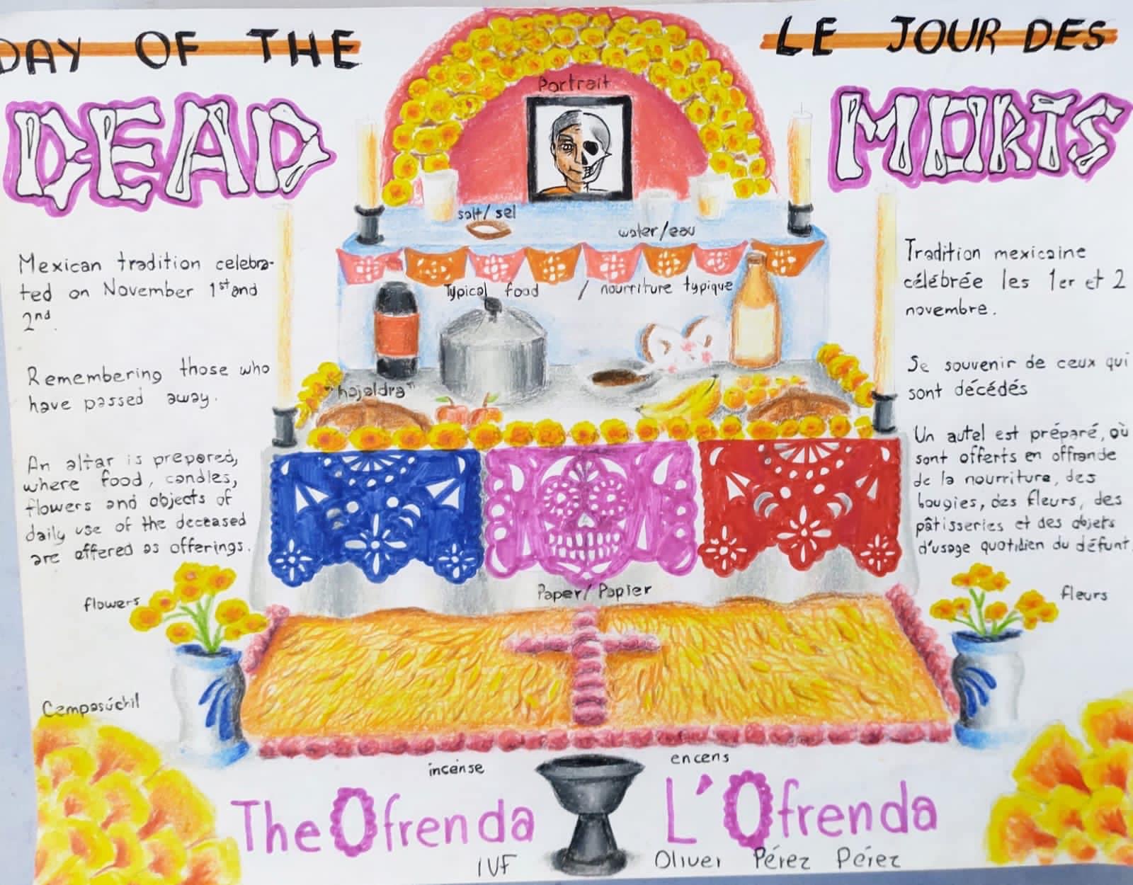 “Estimada comunidad de la preparatoria, la Academia de Lenguas Extranjeras invita a los alumnos a participar en la demostración de dibujos de ofrendas del Día de muertos”.
