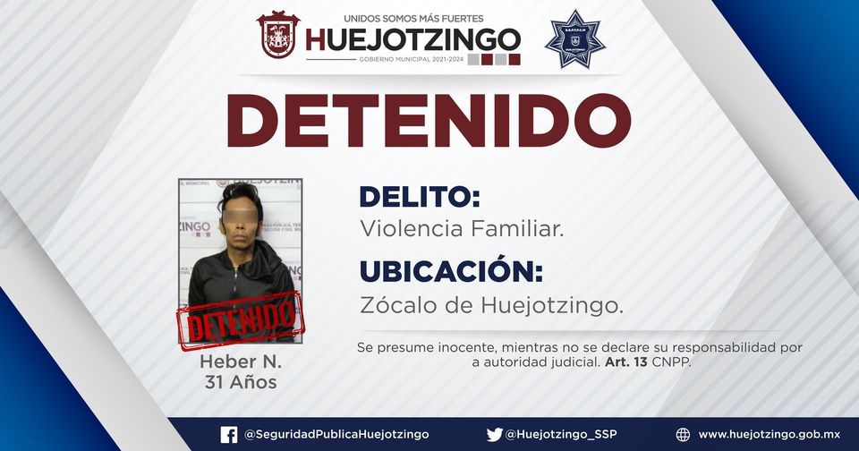 Huejotzingo, Pue.- Mientras realizaban recorrido de seguridad y vigilancia preventiva, Policías Municipales, detuvieron en el zócalo de Huejotzingo, a Heber N., de 31 años de edad, por su probable responsabilidad por el delito de violencia familiar.