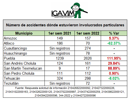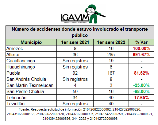 En las cifras, destaca que en el municipio de Atlixco los percances ligados al transporte público aumentaron de 36 en la primera mitad de 2021 a 285 para este año, lo que implica 249 más, que equivalen a 691.6 por ciento.