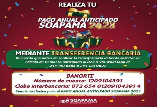 Realiza el pago Anual Anticipado Soapama 2023 por transferencia bancaria