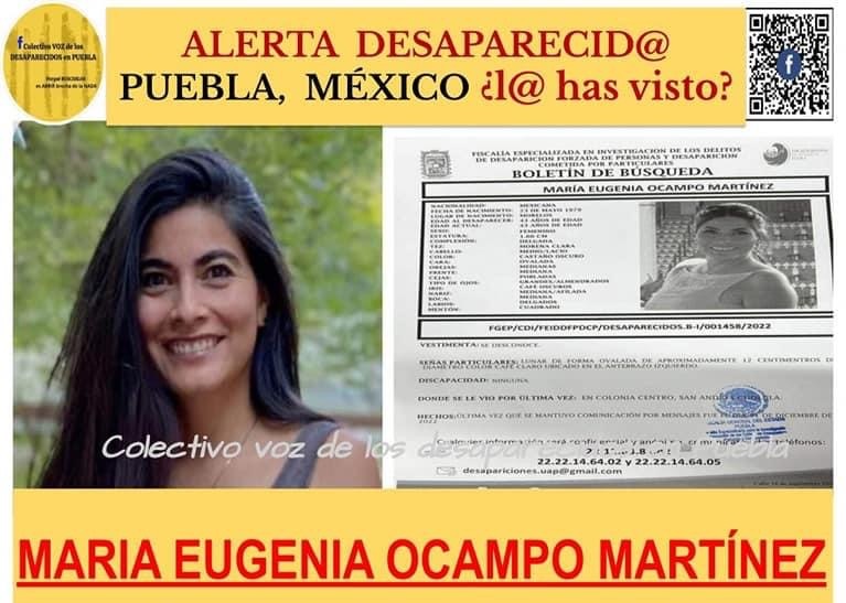 San Andrés Cholula, Pue.- María Eugenia Ocampo Martínez, una mujer originaria de Morelos, fue reportada como desaparecida en el municipio de San Andrés Cholula.
