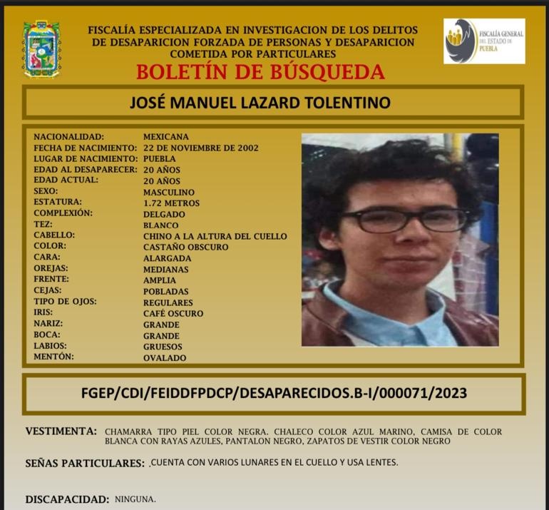 La Fiscalía General de Puebla dio a conocer la desaparición de José Manuel de 20 años de edad.