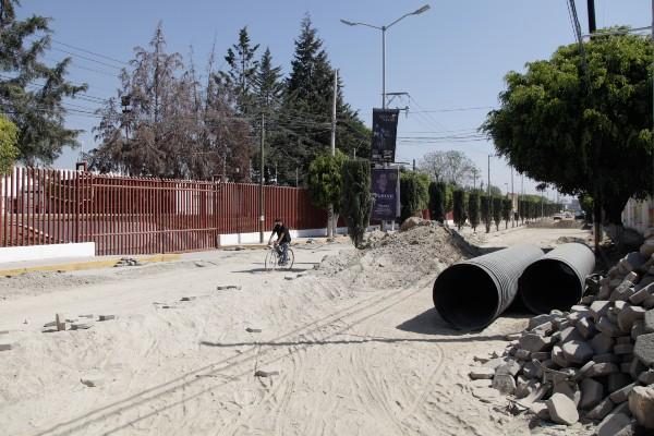 San Andrés Cholula, Pue.- Continúa la rehabilitación de los trabajos de ampliación del drenaje pluvial y rehabilitación del drenaje sanitario sobre Camino Real a San Andrés Cholula frente a la Universidad del Valle de México (UVM).