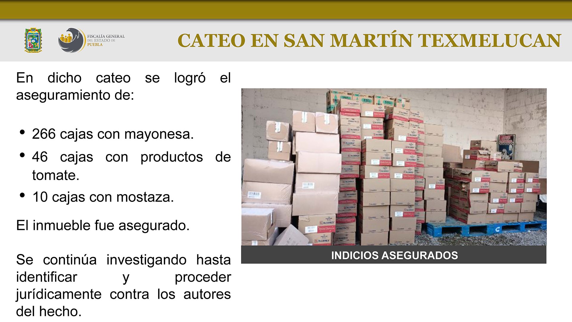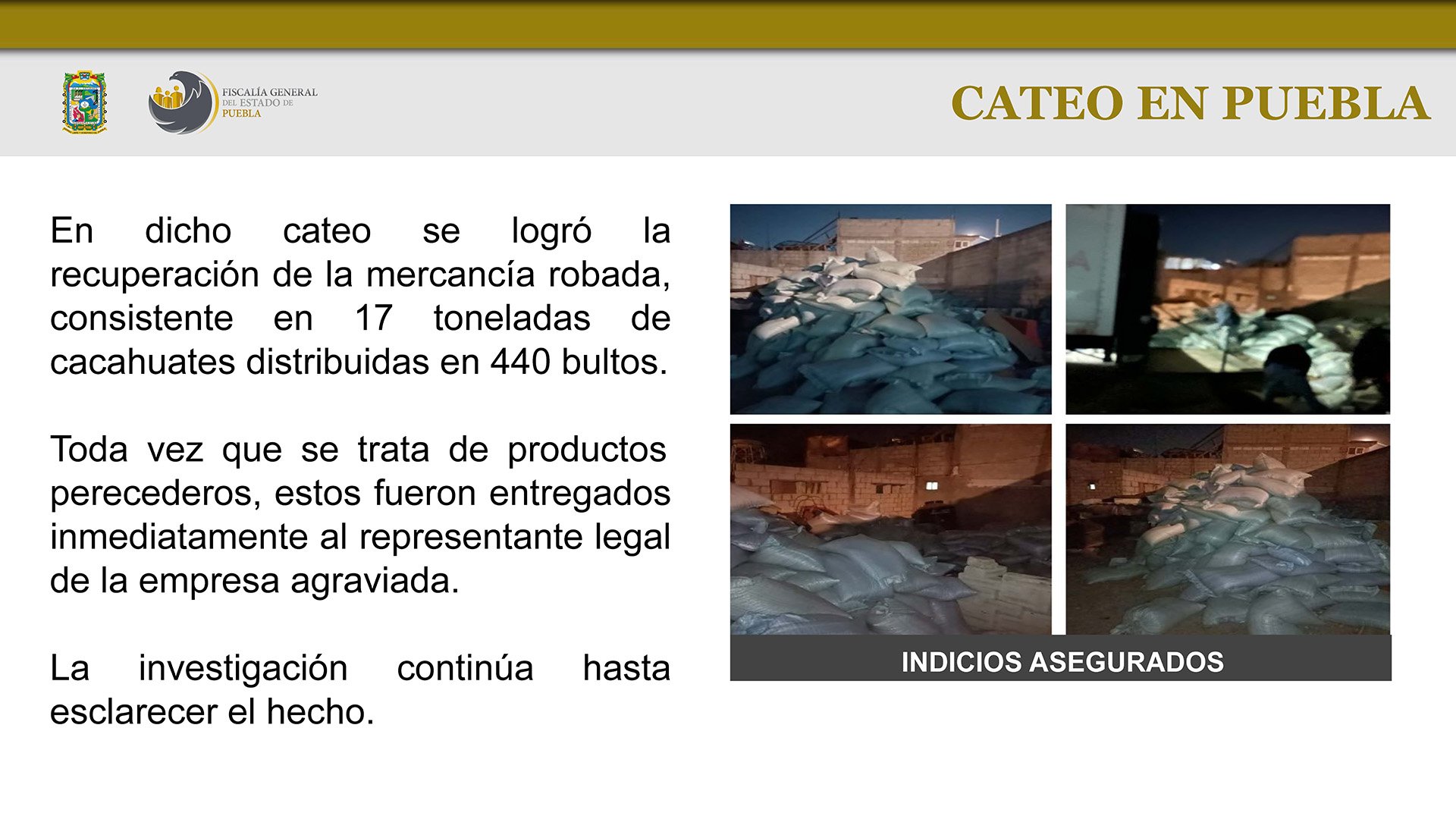 En dicho cateo se logró la recuperación de la mercancía robada, consistente en 17 toneladas de cacahuates distribuidas en 440 bultos. Toda vez que se trata de productos perecederos, estos fueron entregados inmediatamente al representante legal de la empresa agraviada.