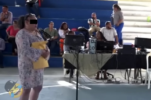 En la grabación, se observa que la aspirante a maestra de inglés es evaluada en el centro de lo que parece ser un gimnasio, en cuyas gradas se observan algunas personas. Docentes, presiden la reunión.