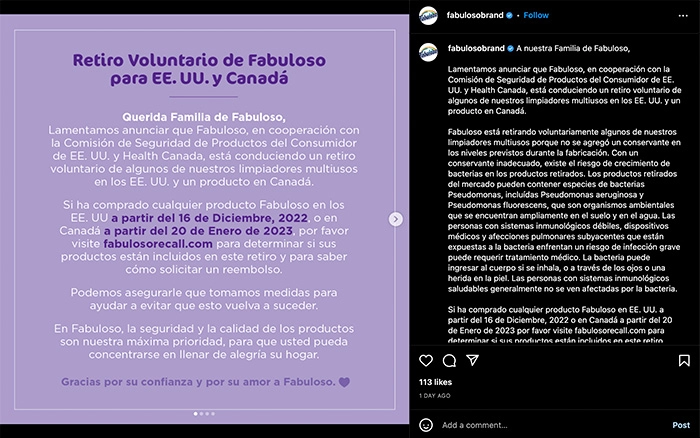 A través de un mensaje en redes sociales, el fabricante de Fabuloso, Colgate-Palmolive confirmó el retiro voluntario del limpiador multiusos en Estados Unidos y Canadá.