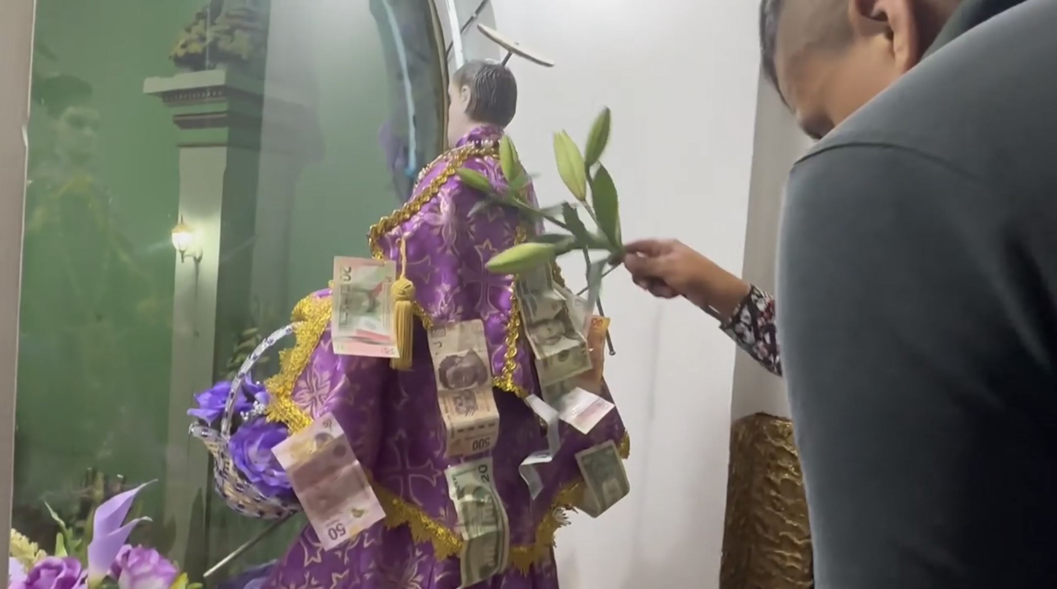 Momento aprovechado por los lugareños para agradecer, con dólares colgados en la pequeña ropa de la figura y rezos, las atenciones para con los habitantes del último año.