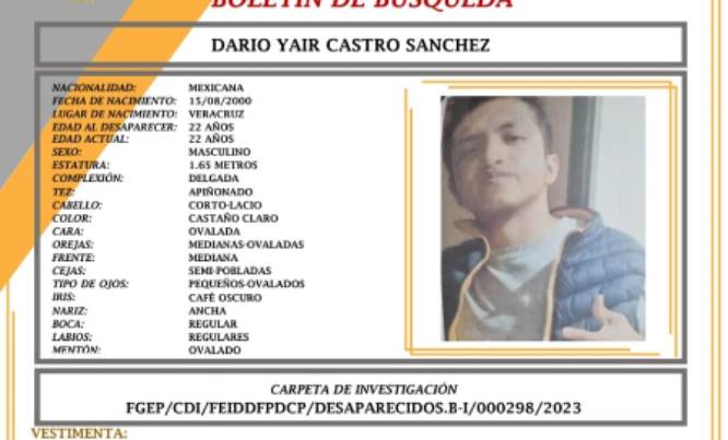 La desaparición de Dario Yahir, está dentro de la carpeta FGEP/CDI/FEIDDFPDCP/DESAPARECIDOS.B.1/0000298/2023.
