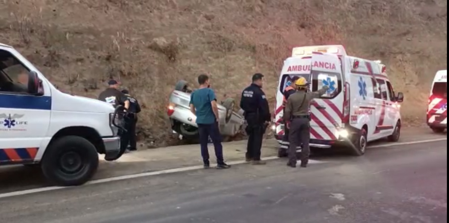 El chofer perdió el control del auto compacto gris de la marca Volkswagen el cual quedó totalmente de llantas para arriba en una pronunciada curva.