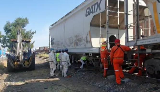 Trabajadores de Ferrosur ya trabajan para corregir el descarrilamiento de dos vagones, a un costado del mercado Ignacio Zaragoza.