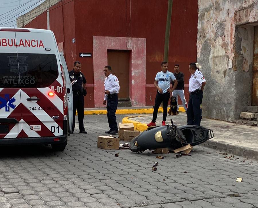 Atlixquense derrapa su moto, se descalabra y tira cervezas que trasportaba