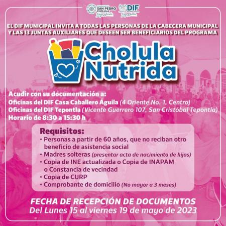 San Pedro Cholula, Pue.- Del lunes 15 al viernes 19 de mayo se abrirá la convocatoria para participar en el programa Cholula Nutrida en el municipio de San Pedro Cholula, por lo que se llama a todos los adultos mayores de más de 60 años y madres solteras a acudir con su documentación para ser beneficiarios.