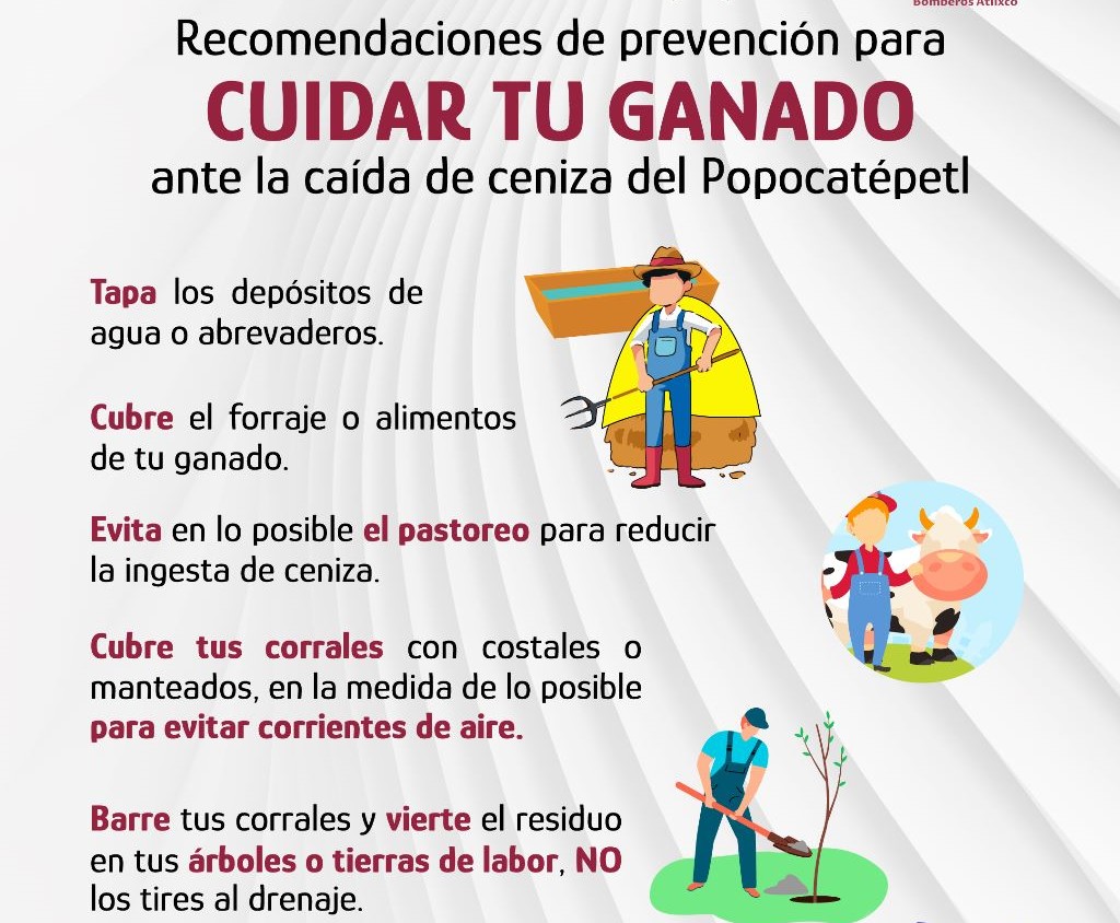 Los residuos emitidos por el coloso, afectan principalmente los ojos, la piel y las vías respiratorias de los animales, por ello, a través de la Dirección de Desarrollo Económico y Fomento al Sector Agropecuario, se han recomendado a las familias que cuentan con ganado tapar los depósitos de agua o abrevaderos, cubrir forrajes o alimentos, evitar en lo posible el pastoreo para reducir la ingesta de ceniza.