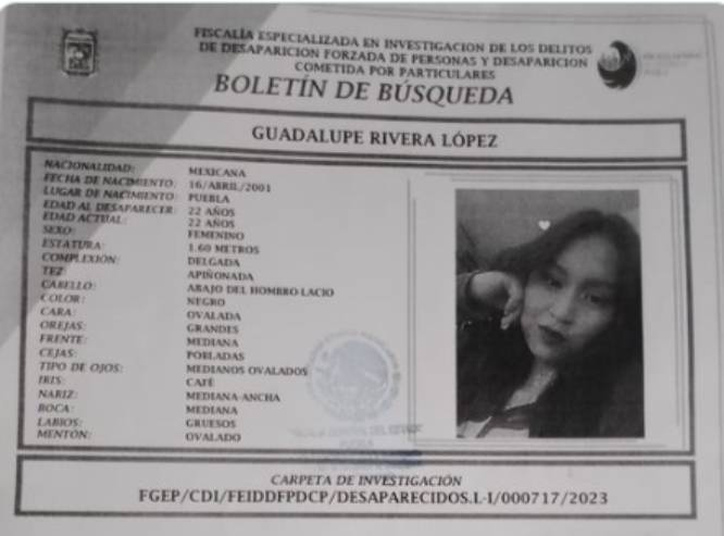 Puebla, Pue.- La Fiscalía General de Puebla dio a conocer la desaparición de Guadalupe Rivera López, de 22 años de edad.