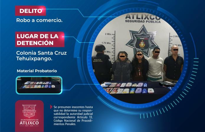 La primera de estas acciones derivó de un reporte oportuno por personal de una tienda comercial con razón social “Bodega Aurrera”, ubicada en la colonia Santa Cruz Tehuixpango, gracias a la pronta intervención de policías municipales, se detuvo a dos masculinos y dos féminas, originarios del estado de Puebla, quienes después de cometer el delito, pretendían huir en una camioneta cerrada color café.