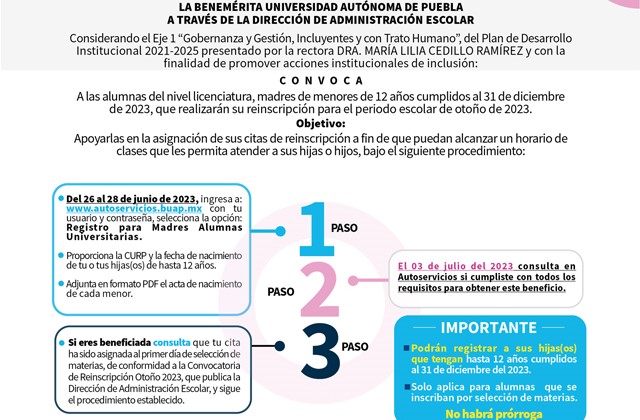 Puebla, Pue.- En apego a una gestión incluyente y con trato humano, la Dirección de Administración Escolar (DAE) de la BUAP emitió la convocatoria para que alumnas que son madres y cursan una licenciatura tengan facilidades en la asignación de citas que correspondan al proceso de reinscripción del periodo Otoño 2023, con la finalidad de conformar un horario de clases que les facilite la crianza y atención a sus hijos e hijas.