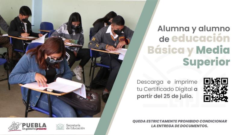 Puebla, Pue.- La Secretaría de Educación Pública de Puebla (SEP) dio a conocer que a partir de este martes 25 de julio ya podrán descargarse e imprimirse los certificados de los alumnos de instituciones públicas y privadas.