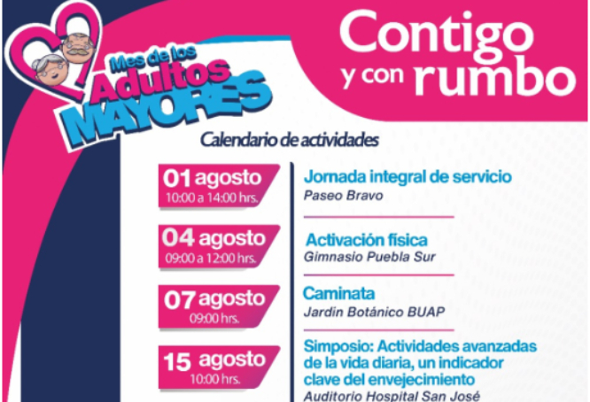 Desde la Unidad Médico Integral (UMI) del SMDIF, Ortiz Pérez anunció este calendario conmemorativo que incluye jornadas de servicios de salud, activación física y para el desarrollo artístico, un simposio sobre las claves del envejecimiento, una caminata recreativa, un baile de gala, juegos estatales con 24 disciplinas como béisbol, cachibol, natación, danza de salón, tabla rítmica, dominó, poesía, ajedrez y mucho más; todo en colaboración con el Instituto Nacional de las Personas Adultas Mayores (INAPAM) y la Benemérita Universidad Autónoma del Estado de Puebla (BUAP).