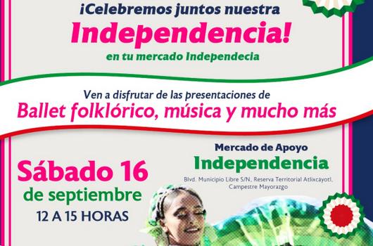 El Ayuntamiento de Puebla -que preside Eduardo Rivera Pérez-, a través de la Dirección de Mercados de la Secretaría de Economía y Turismo, invita a las familias a celebrar las Fiestas Patrias este 16 de septiembre en el Mercado Independencia, ubicado al sur de la ciudad, de 12:00 a 15:00 horas.