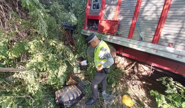 El personal se trasladó al lugar, donde encontraron un vehículo de carga accidentado que permanecía entre la maleza, que se presume se salió de la carretera y se impactó contra una señal de tránsito.