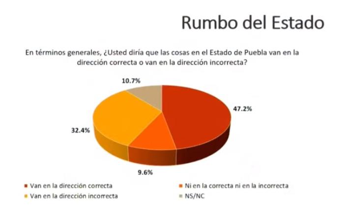 En el estudio propio señala que el 47.2 por ciento de los entrevistados considera que el rumbo del estado va en la dirección correcta, un 32.4 por ciento estima que va en la incorrecta, un 9.6 no se decantó por una u otra y 10.7 no supo o no contestó.