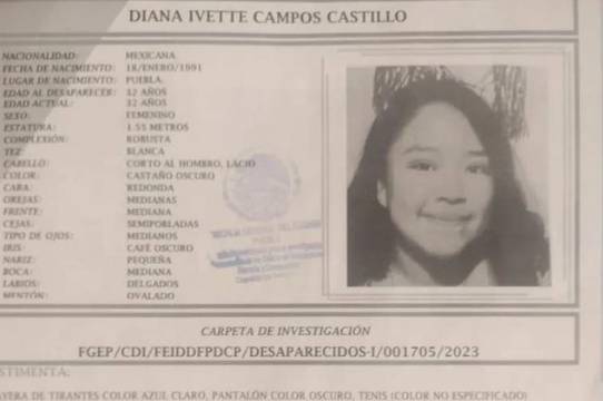 Puebla, Pue.- La Fiscalía General de Puebla dio a conocer la desaparición de Diana Ivette Campos Castillo, de 32 años de edad.