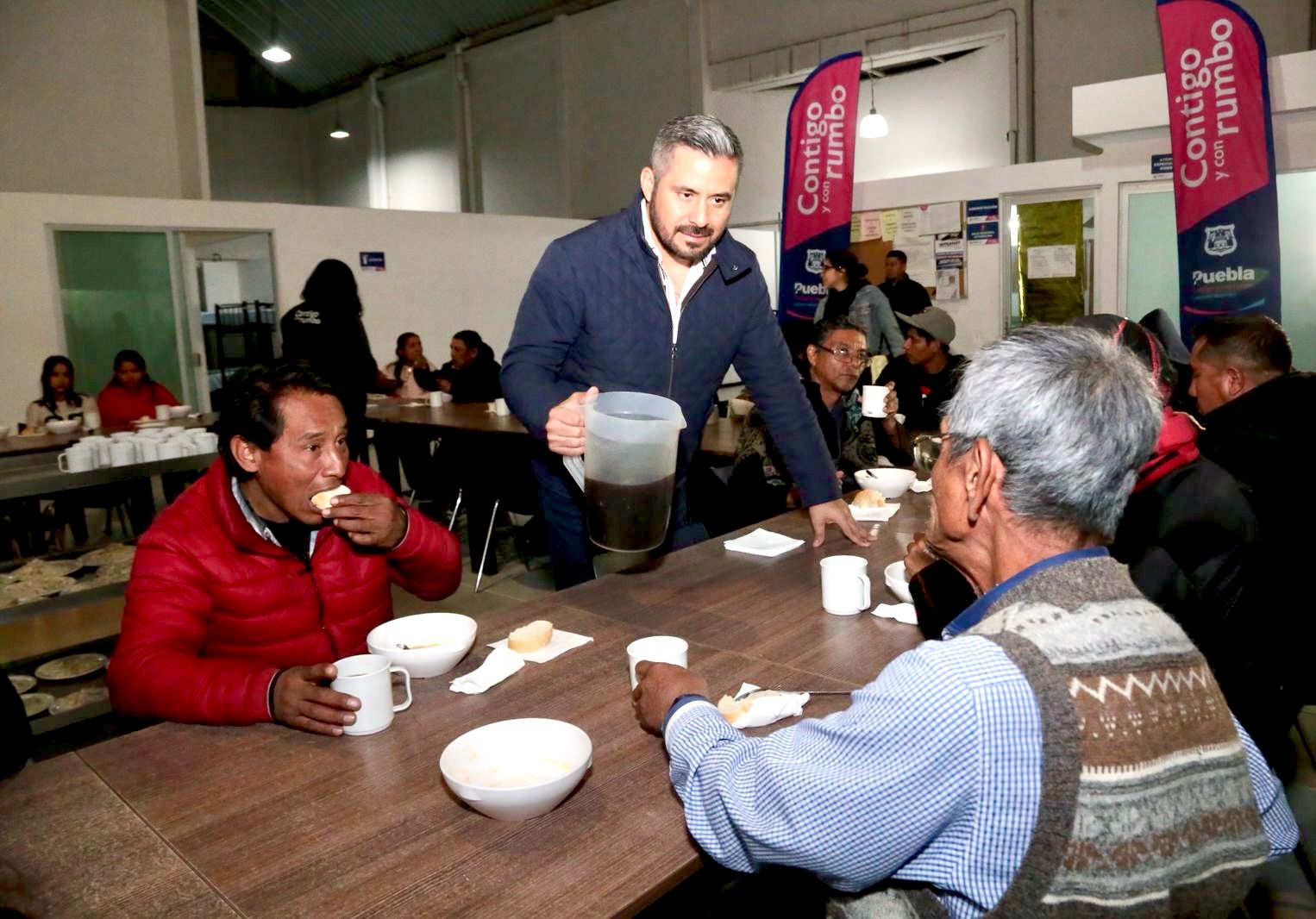 Puebla, Pue.- En esta ocasión el presidente municipal de Puebla, Adán Domínguez Sánchez, acompañado por su esposa, Claudia Barrientos Hernández, sirvieron la tradicional cena de fin de año a las usuarias y usuarios del Dormitorio Municipal, quienes degustaron: espagueti rojo, pierna en salsa blanca, ensalada de manzana y té, café y/o ponche.