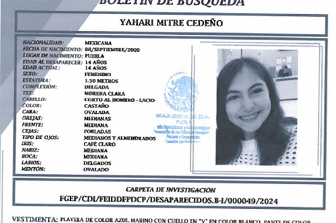 Puebla, Pue.- La Fiscalía General de Puebla informó sobre la desaparición de Yahari Mitre Cedeño de 14 años de edad.