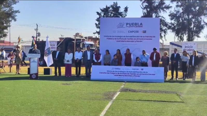 Puebla, Pue.- El gobernador de Puebla, Sergio Salomón Céspedes Peregrina, dio el banderazo de inicio a los trabajos de rehabilitación de la cancha de fútbol y de la pista de tartán en el Centro Escolar "José María Morales y Pavón".