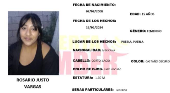 Puebla, Pue.- La Fiscalía General de Puebla activó la alerta Amber para localizar a la adolescente Rosario Justo Vargas, de 15 años de edad.